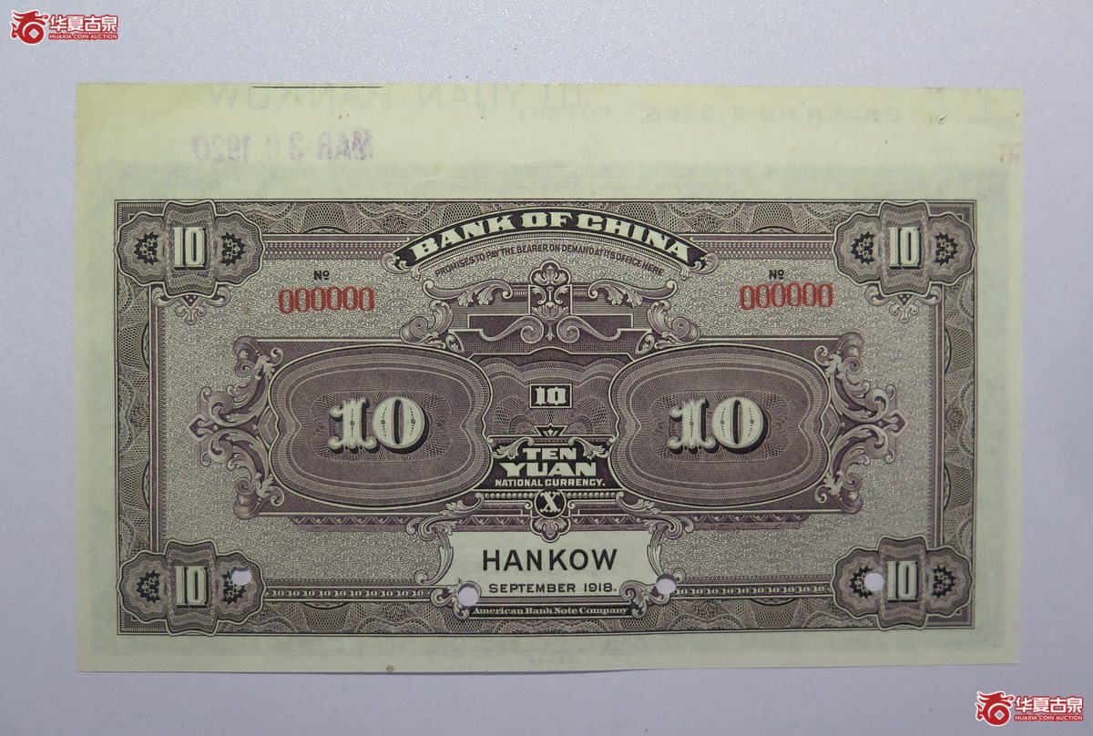 民国纸币民国七年中国银行拾圆美国钞票公司样票(汉口)