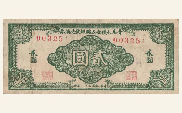 民国三十一年晋高长陵壶五县银号兑换券贰圆