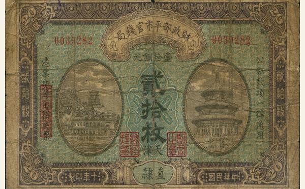 民国纸币民国十年财政部平市官钱局贰拾枚(直隶)