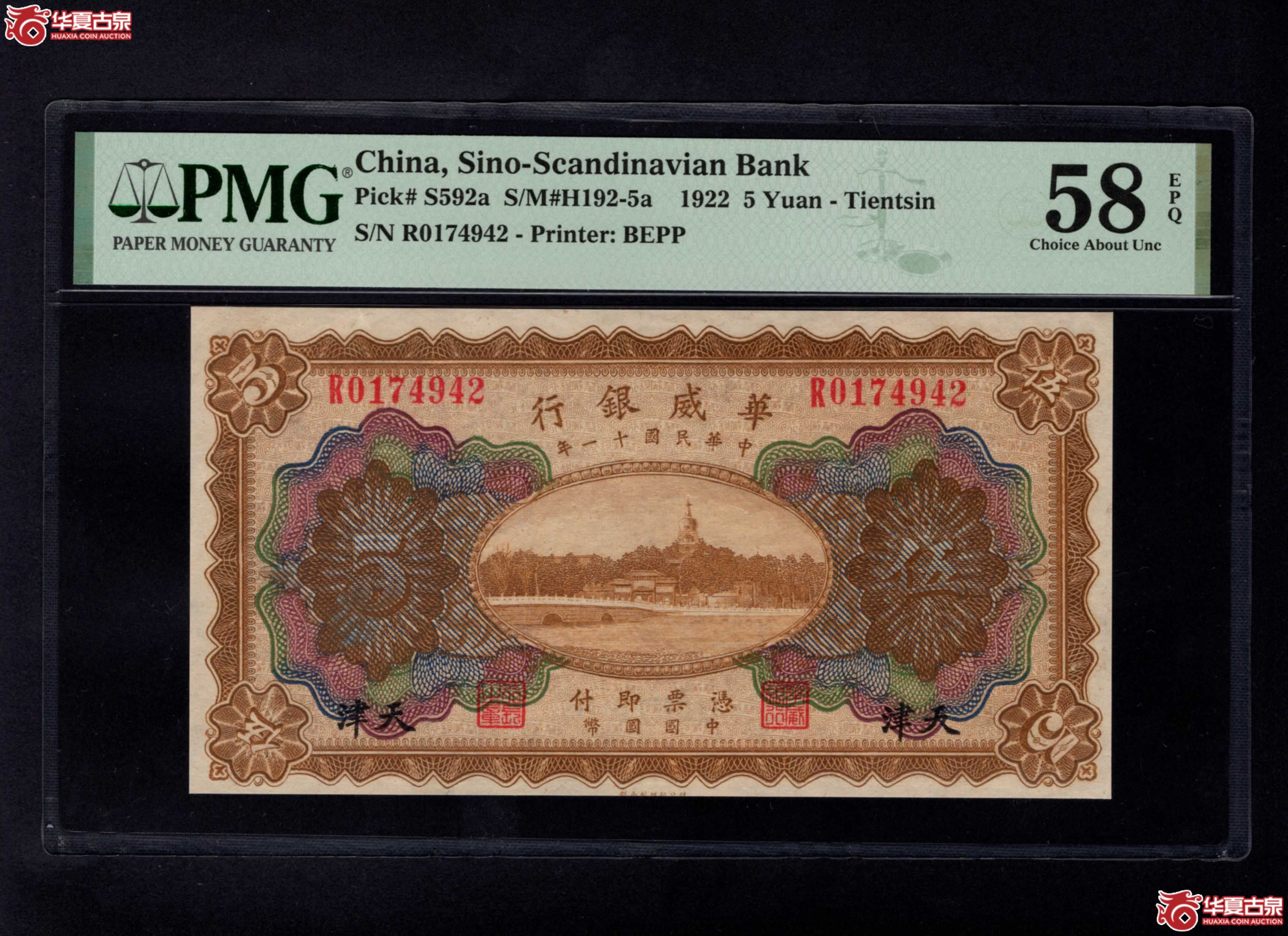 (PMG64)民国十一年天津华威银行伍圆041042SSQ